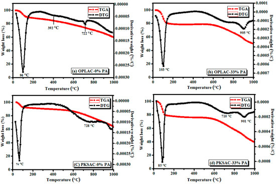 Thermogravimetric analysis (TGA), and its derivatives (ΔTG), is one of the useful techniques employed to study the combustion and thermal behavior of biomass materials. The analysis serves as the basis or initial guideline for determining the exact temperature range in which the activation is to be carried out. Therefore, the data and results obtained from this analysis are very critical for evaluating the kinetic behavior of the materials during its disintegration in the oxidizing medium. It is worth remembering that the precursors used to prepare our activated carbon were wastes from typical plant or biomass materials generated from the oil palm plantation industry. Like any other biomass, oil palm leaves and palm kernel shells, as used in this study, consist mainly of hemicellulose, lignin, and cellulose, with some biopolymer extractives being inconsequential components. In effect, the presence of those former components in the precursors (biomass) has a considerable effect on the physical properties and thermal disintegration reaction of the materials. Therefore, the combustion and decomposition of these components, as the feedstock is pyrolyzed, will give greater insight as to the thermal characteristics of the as-produced materials, which was the main objective of these analyses. The broad peaks at around 74, 85, 96, and 100 °C, as in all the ΔTG curves (Figure 14), are ascribed to the elimination of physically adsorbed water [37] and the dehydration of oil palm precursors. It is widely described that the thermal decay of hemicelluloses occurs at temperatures between 150 to 350 °C, whereas cellulose and lignin are decomposed in the temperature ranges 275–350 °C and 250–500 °C, respectively [73]. However, in some cases, decomposition of lignin may occur even beyond 700 °C, of which is varied from one precursor to another, and the bond type involved (sp2 or sp) that would be broken. In this light, the peaks observed at 392 °C in OPLAC-0% PA could be ascribed to the thermal disintegration of hemicelluloses, whereas those at above 700 °C (Figure 14a–d) could be attributed to lignin disintegration. In general, this analysis provided an important data that is essential in the activated carbon preparation, processing, characterization, and application [74].