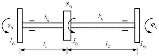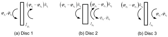 From the free body diagrams of individual discs, three equations of motion for free torsional vibration are then expressed using the matrix formulation per Equation (3) below: