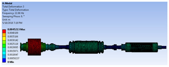 The 3D model of the shaftline configurations that were created in CATIATM V5 [24] are used to perform torsional dynamic analysis in ANSYS® 19.0 Workbench [25] to find the torsional natural frequencies and mode shapes. The separation of the frequencies will be evaluated with respect to the dominant excitation frequencies for the target markets (50 Hz for general grid disturbances and 100 Hz for negative sequence currents).