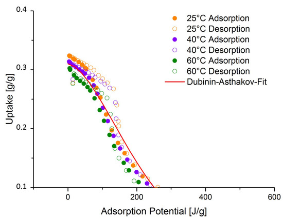 Plot of the water sorption isotherms of silica gel at different temperatures during ad- and desorption. The red line depicts the adapted Dubinin-Asthakov-Fit; data points and fits for other materials are provided in the Supplementary Materials.