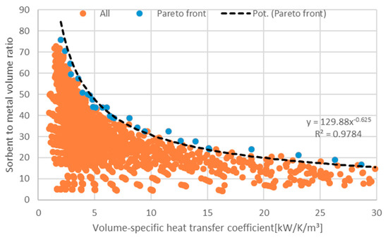 Out of the results of the parameter variation, a pareto front could be derived, which gives achievable volumetric sorbent to metal ratio for any desired heat transfer coefficient (Figure 6). Realized pilot storages have shown that a heat transfer coefficient above 1 kW/K/m3 is essential, especially for discharging with a reasonably low driving temperature difference. In order to meet this value and to account for possible imperfections in real systems compared to the calculations, a value of 3 kW/K/m3 was adopted. Thus, the volumetric sorbent to metal ratio was 65.