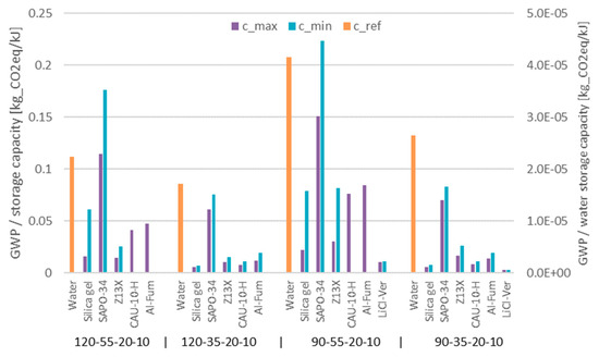 Global warming potential per storage capacity of selected materials (left axis: sorption materials; right axis: water) for different boundary conditions (Tdes-Tads-Tcond-Tevap); for MOFs and Tads = 55 °C, c min is negative, so no values are shown.