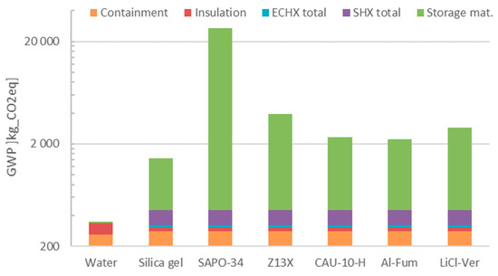 Figure 11 breaks up the GWP of the resulting 1 m3 storages by the main parts. Interestingly, the steel cylinder for the water storage with a mass of 147.5 kg and the stainless steel housing of the sorption storages (47.4 kg) had a very similar impact due to the higher specific impact of the latter metal. The thicker insulation of the water storage evidently resulted in a higher absolute GWP. The water itself had a negligible impact. The SHX contributed about half the GWP of the containment, and the ECHX contributed roughly another 10%. The sorbents accounted for the major share of the overall GWP: From 69%, in case of silica gel, up to 98% for SAPO-34.