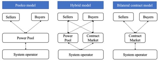Difference between poolco model, hybrid model, and bilateral contract model.