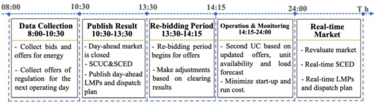 At 08:00, the day-ahead market is open. Market participants submit information about generation offers, demand bids, demand response bids, and virtual bids of the next day to ISO. At 10:30, the day-ahead market is closed. The ISO will arrange electricity generation and calculate day-ahead locational marginal prices (LMPs), based on security constrained unit commitment (SCUC) and security constrained economic dispatch (SCED) models.