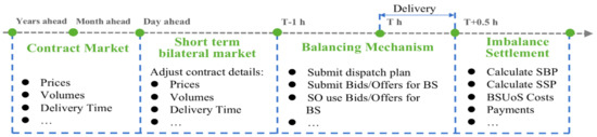 The British Electricity Trading and Transmission Agreements (BETTA) adopt the bilateral contract model. The operation of BETTA is composed of four parts: Contract market, short-term bilateral market, balancing mechanism, and imbalance settlement (IS). Figure 5 shows the transaction process of BETTA [45].