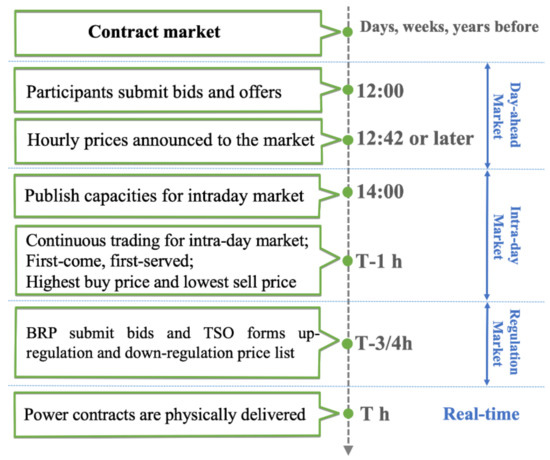 One of the typical hybrid markets is Nord Pool where electricity is traded in a spot market with bilateral contracts [55]. Before the spot market opens, participants need to submit information about the bilateral contracts to the TSO to calculate the rest transmission capacity. The spot market is composed of the day-ahead market, intraday market, and real-time regulating market, which will be operated based on the transmission capacity left [56]. The clearing process of Nord Pool is shown in Figure 7.