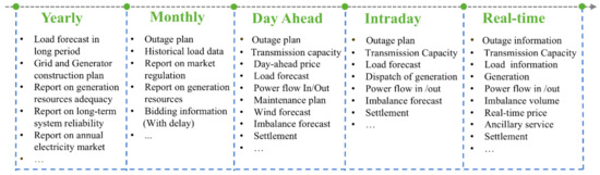 Currently, numerous efforts have been devoted to the research of electricity markets, including basic design, structure, and operation of electricity markets [4,5,6,7,8,9,10,11,12]. In addition, some of the studies are focused on the information disclosure mechanisms in the electricity market. References [13,14] explain that disclosing critical information about electricity offerings and electricity price is important to improve market competition. References [15,16] find that the transaction and utilization of clean energy can be improved by disclosing mandatory information of clean energy to consumers. Reference [17] shows that disclosing electricity market information is advantageous, since the exercise of market power can be exposed and restricted by the disclosure of bidding data. In the previous studies, it is widely recognized that the information disclosure mechanism is crucial to the efficient operation of electricity markets. However, few researchers have studied the information disclosure in different electricity markets. The approach and extent of information disclosure in different electricity markets has not been clearly compared. Thus, additional efforts are required to study the information disclosure mechanisms in electricity markets in order to identify good practice and the potential scope for improvement. In this paper, the disclosed information, which is divided into generation information, grid information, load information, price information, and bidding information are introduced following the transaction process of different electricity markets.
