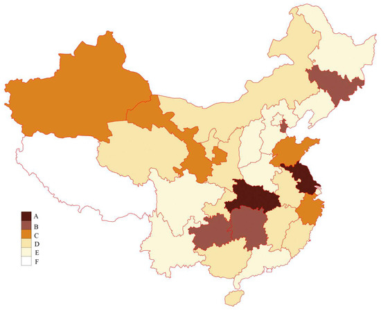 In this section, the relationship between the economy and CO2 emissions in the power industry, electric carbon productivity, and emission structure will be discussed in order to explore the targeted economic development mode for different provinces. The mean values of each indicator’s relative contribution (, , and ) are used as criteria for classifying categories. If the relative contribution value of one indicator is more than the average value of this factor, 1 is assigned to this province; otherwise, 0 is assigned. Then, the state vector for each province can be obtained, leading to different categories, as shown in Appendix Table A4. The map of different provinces is painted accordingly with different colors, as shown as Figure 1, to observe geographic homogeneity and heterogeneity. The geographic difference is analyzed based on Appendix Table A6 and Figure 1. The possible reasons for regional difference could be analyzed; they include status of economic development, industrial structure, low-fossil-fuel area and fossil-fuel-dominated area, power generation technology and environmental protection, and technology gap for different categories, among others.