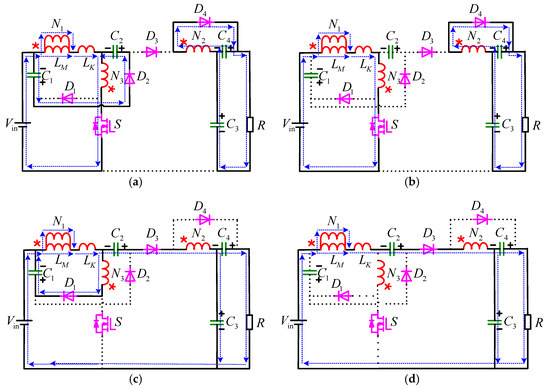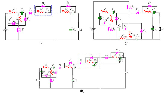 According to the different connection position, the proposed circuits can be derived in Figure 6. When applying series-connected voltage-lift networks (VLN), the voltage gain is enhanced by adding some VLN modules in Figure 6a. The voltage gain equation is derived from:
