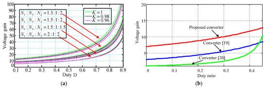 Voltage gain comparisons: (a) voltage gain under different coupling coefficients K; and (b) among the proposed converter, the converters in [19,20] at CCM operation under N3:N2:N1 = 2:1:4.