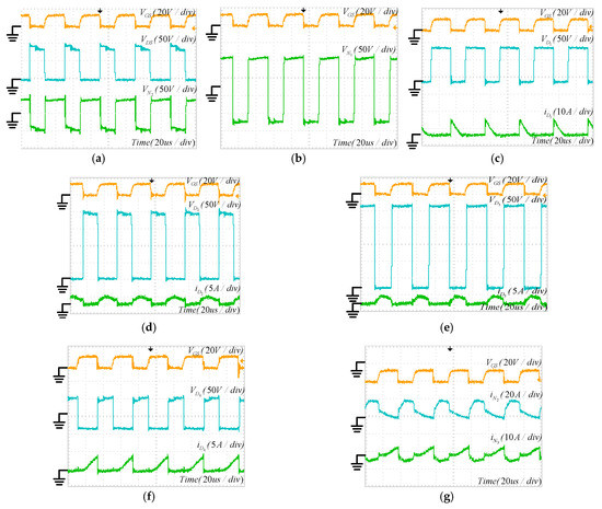 Experimental waveforms of the proposed converter. (a) Voltages of drive signal, switch and winding N2; (b) voltages of drive signal and winding N1; (c) voltages of drive signal, voltage and current of diode D1; (d) voltages of drive signal, voltage and current of diode D2; (e) voltages of drive signal, voltage and current of diode D3; (f) voltages of drive signal, voltage and current of diode D4; and (g) voltages of drive signal, current of windings (N2 and N3).