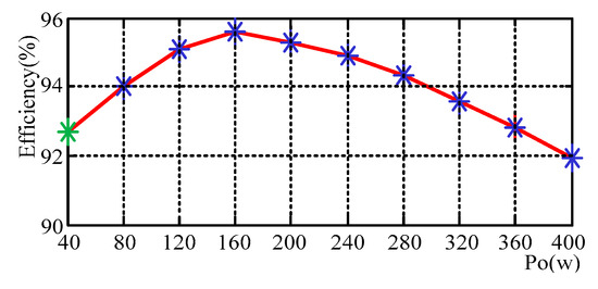 Figure 8 shows the tested efficiency curve of the proposed converter. The power range is 40–400 W, and the efficiency is tested per 40 W. From Figure 8, it can be seen that the efficiency of the proposed converter is about 91.9% when output power is 400 W, while the maximum efficiency of proposed converter is about 95.6% when output power is 160 W.