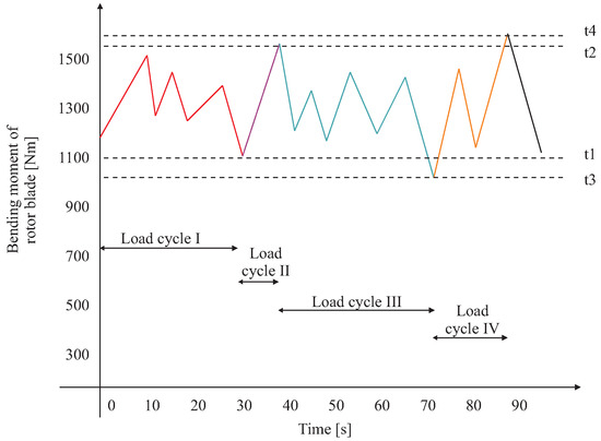 The calculation of damage increments and resulting overall damage in the system is carried out by using the Palmgren–Miner damage accumulation rule and the online Rainflow Counting Algorithm (RCA). RCA in its original form cannot be applied here, as it assumes knowledge about arbitrary loads over the complete service lifetime and is therefore not intended for online implementation [34]. Further, offline implementation is useful neither in real-time systems, nor in simulation models, where control inputs are affected by outputs from RCA. The output of the controller module (including five controllers and the controller selection module) is affected by the output of RCA, so an online RCA implementation is required. In this contribution, an implementation of the online RCA proposed by Musallam et al. [34] is employed. Such an implementation of RCA does not require tracking of complete time-history data (here, structural loads) to obtain equivalent half- and full-loading cycles. The above-mentioned algorithm processes each extremal value (minimum and maximum) at the time of their occurrence, as depicted in Figure 1. Equivalent half and full cycles generated using online RCA are further integrated in the Palmgren–Miner damage accumulation rule to calculate the Remaining Useful Lifetime (RUL) under the assumption of a known predefined service lifetime given by the manufacturer. The wind turbine predefined service lifetime is assumed as 20 years.