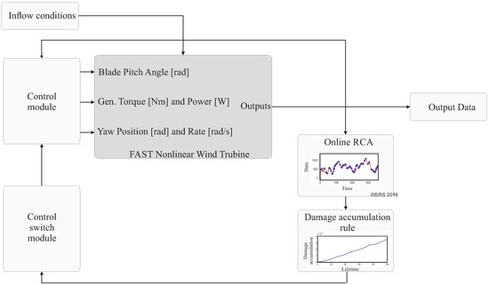 The tuning of controllers includes the selection of suitable Q and R matrices corresponding to different levels of structural load reduction. Not all system states are directly accessible, implying the utilization of the Kalman filter to estimate the inaccessible system states. The linearized model introduced in Section 2.1 is used to design the controllers. The complete control scheme with integrated fatigue load examination is depicted in Figure 2. Inputs to the control module according to Figure 2 are, besides measured or estimated system variables, estimated damage increments or accumulated damage over time (depending on the considered case).
