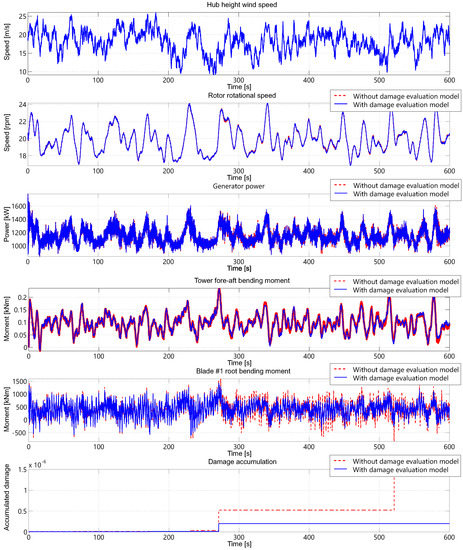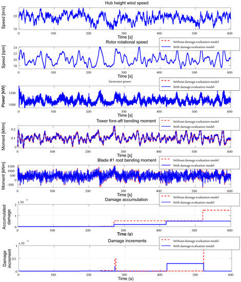 The results obtained under the usage of the fatigue damage evaluation model along with controller selection based on information about the damage accumulated over the service lifetime are depicted in Figure 3 and Figure 4. Similarly, the results obtained using controller selection based solely on information about damage increments are given in Figure 5 and Figure 6.