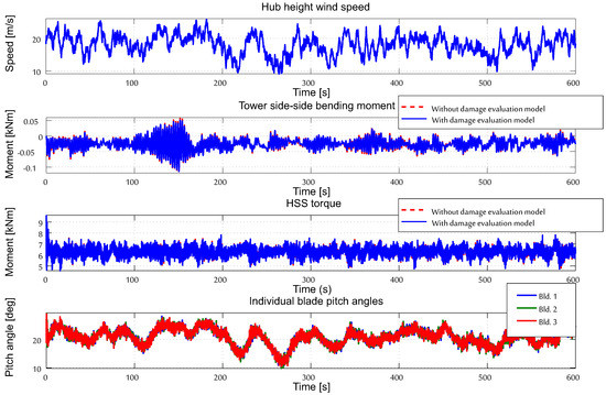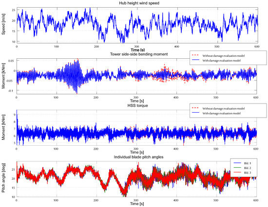 All cases depicted in Figure 8 and Figure 9 were analyzed. Three cases are stated in Table 1 as: (i) Case I, the model without structural load reduction consideration: the baseline PI controller; (ii) Case II, the model with the consideration of structural load reduction: controller selection based on accumulated damage; and (iii) Case III, the model with the consideration of structural load reduction: controller selection based on damage increments. However, the same conclusion was made, as the highest discrepancy in the standard deviation was obtained for bending moments, whilst the same did not change to a great extent for HSS torque and generated power.
