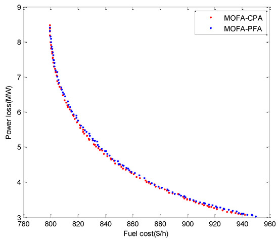 To verify the effectiveness and performance of the proposed MOFA-CPA algorithm, the PFs of the optimization study Case 1 obtained by MOFA-CPA and the compared MOFA-PFA are shown in Figure 1. It appears that the PF obtained with cost and loss minimization by MOFA-CPA is well distributed over the PF obtained with cost and loss minimization by MOFA-PFA. It can also be observed that the PF of MOFA-CPA is closer to true PF than the PF of MOFA-PFA.