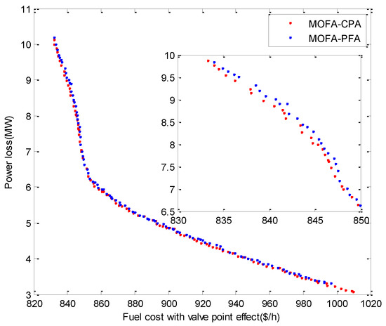 Figure 3 shows the PFs of emission and loss with value point effect minimization obtained by MOFA-CPA and MOFA-PFA. From this figure, it can be seen that MOFA-CPA has the ability to cross over inferior solutions obtained by MOFA-PFA and get better Pareto optimal solutions with a better approximation.