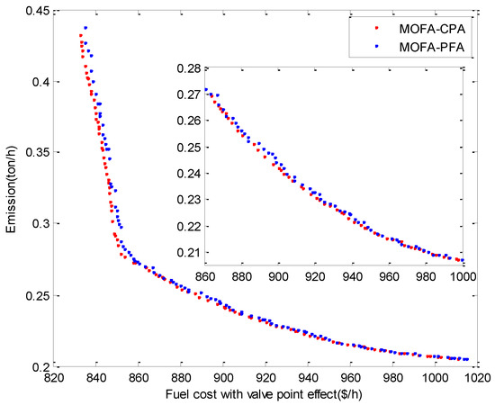 The proposed MOFA-CPA technique and compared MOFA-PFA algorithm have been used for Case 2 and the obtained PFs are given in Figure 2. One conclusion that can be made from this figure is that cost with value point effect makes it more difficult to solve this case and increases the computation time. Furthermore, the evaluation of both objective functions shows that all the true Pareto optimal solutions cannot be obtained by both algorithms, some of the solutions of MOFA-PFA are inferior, and MOFA-CPA method finds more Pareto optimal solution close to the true Pareto optimal solutions.