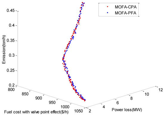 Beyond expectation, a more regular PF shown in Figure 5 is obtained despite non-linearity effects generated by valve-point effects. It is clearly observed from the figures that MOFA-CPA obtains better distributed and approximated PFs compared with MOFA-PFA for the two cases. It is also found that both MOFA-CPA and MOFA-PFA have the ability for solving tri-objective simultaneous minimization while MOFA-CPA has a stronger constraints processing capability.