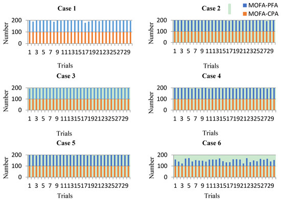 The above analysis and presentation cannot directly show the effectiveness of the proposed CPA constraint processing method. Thus, the number of solutions satisfied constraints among 100 population size in 30 trials for all cases can be seen from Figure 7, which visually shows the performance of the proposed CPA. Also, Table 9 counts success rate (the number of trials when all solutions satisfied constraints in 30 trials) for all cases as a simple numerical example to provide an illustration of the difference between MOFA-CPA and MOFA-PFA.