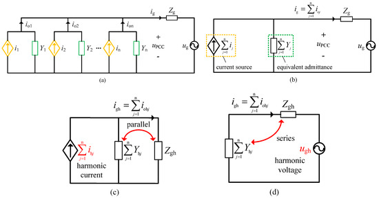 In the grid-connected mode, single inverter is equivalent to the current source ij in parallel with equivalent admittance Yj, which is the Norton equivalent circuit [23]. The grid is equivalent to the grid voltage ug in series with grid impedance Zg. From the PCC, the Norton equivalent circuit of paralleled multi-inverter system is shown in Figure 2a. From Figure 2a, the circuit relationship about uPCC is shown in Equation (1) by the nodal analysis method.