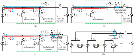 Equivalent schematic diagram. (a) Parallel virtual impedance; (b) series virtual impedance; (c) parallel-series virtual impedances; (d) equivalent output impedance model.