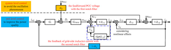 According to Figure 4, Figure 6 gives the control block diagram of the oscillation suppression method by two notch filters for parallel inverters. The first notch filter is introduced into the feedforward path of PCC voltage and the second notch filter is introduced into the feedback path of the grid-side inductor current. The feedback path of the grid-side inductor current with the notch filter is equivalent to a virtual impedance in series with inverter output impedance, which can effectively improve the power quality of the grid-connected current. The feedforward path of PCC voltage with the notch filter equals to a virtual impedance in parallel with inverter output impedance. This can effectively restrain the parallel inverters’ harmonic current from flowing into the grid and avoid the oscillation phenomenon. H1j is the feedback coefficient of the grid-side inductor current, and H2j is the feedforward coefficient of PCC voltage.