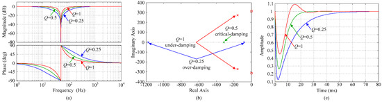 The analysis diagrams of the notch filter with Q = 0.25, 0.5, and 1 are shown in Figure 7. From Figure 7a, the larger Q is, the better the notch characteristic of the notch filter, but the worse the frequency adaptability. From Figure 7b, when Q = 0.25, the characteristic equation has two unequal real poles on the negative real axis of the s plane, which is over-damping. When Q = 0.5, the characteristic equation has two equal real poles on the negative real axis of the s plane, which is critical-damping. When Q = 1, the characteristic equation has the conjugate complex poles on the left half plane, which is under-damping. From Figure 7c, the tuning time of notch filter with Q = 0.5 is better than Q = 0.25, 1. Therefore, considering the notch characteristics and dynamics comprehensively, the Q value was selected to be 0.5.