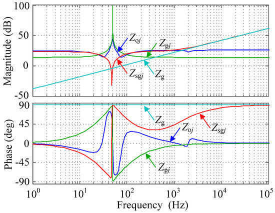 The Bode diagrams of the inverter self-impedance Zoj, parallel virtual impedance Zpj, grid equivalent impedance Zsgj, and grid impedance Zg.