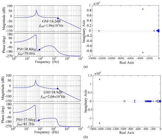 The open-loop Bode diagrams and closed-loop pole-zero diagrams of the equivalent coefficient of current source Gjeq for single inverter in different cases. (a) Case I; (b) Case II.
