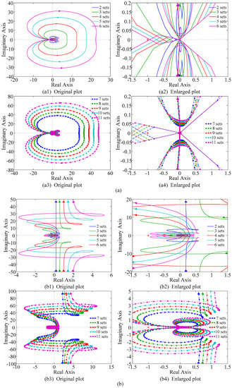 Nyquist diagrams of impedance ratio K for the paralleled multi-inverter system. (a) Case I; (b) Case II.