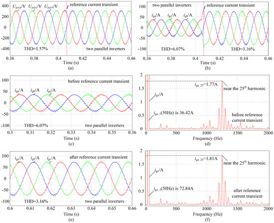 In case I, the transient simulation waveforms of PCC voltage uPCC and grid-connected current ig are depicted in Figure 12a,b. It can be seen that the distortion rate of PCC voltage uPCC is 1.57%. The grid-connected current ig and corresponding spectrum from 0.30 s to 0.36 s are shown in Figure 12c,d, which describes the situation before the reference current surges. The distortion rate of grid-connected current ig is 6.07%, the resonance point is near the 25th harmonic (1250 Hz), and the resonance peak is 1.77 A. The grid-connected current ig and corresponding spectrum after the reference current suddenly increases are shown in Figure 12e,f. The distortion rate of grid-connected current ig decreases to 3.16%, the resonance point is still near the 25th harmonic (1250 Hz), and the resonance peak value is 1.81 A. At this time, the major high-frequency harmonics of the grid-connected current are 25th harmonics.