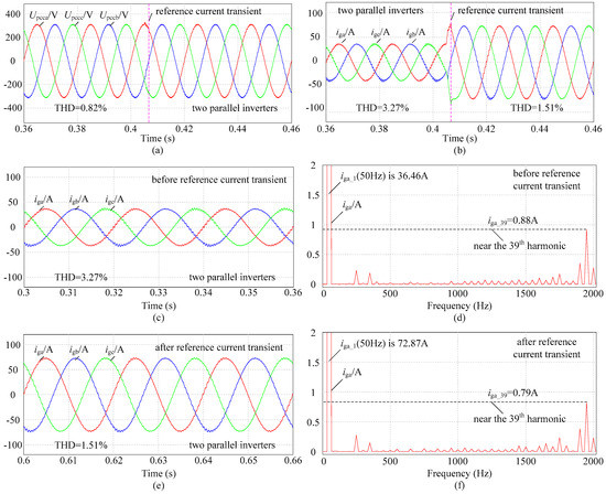 In case II, the transient simulation waveforms of PCC voltage uPCC and the grid-connected current ig are depicted in Figure 13a,b. From Figure 13a, the distortion rate of PCC voltage uPCC is 0.82%. The grid-connected current ig and corresponding spectrum before the reference current surges are shown in Figure 13c,d. The distortion rate of the grid-connected current ig is 3.27%, the resonance point is near the 39th harmonic (1950 Hz), and the resonance peak is 0.88 A. The grid-connected current ig and corresponding spectrum after the reference current suddenly increases are shown in Figure 13e,f. The distortion rate of the grid-connected current ig decreases to 1.51%, the resonance point is still near the 39th harmonic (1950 Hz), and the resonance peak value is 0.79 A. Meanwhile, the power quality of the grid-connected current can be significantly improved, and the resonance phenomenon has obviously decreased.