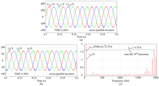 When seven inverters are connected to a weak grid in cases I and II, the RMS of reference grid-side inductor current irefm for each grid-connected inverter is 10.71 A. Therefore, the RMS of the reference grid-connected current igref is 75 A for seven parallel inverters. The simulation waveforms and spectrograms of PCC voltage uPCC and the grid-connected current ig are shown in Figure 14 and Figure 15. The simulation results of the grid-connected current with seven parallel inverters are shown in Table 4. In case I, the system is in an unstable state. The resonance phenomenon is obvious. The reason is that the high-frequency harmonic current frequency is equal to or close to the parallel resonance frequency of self-impedance, resulting in a parallel resonance or quasi-resonance of the impedance network. The grid-connected current is still severely polluted by the impedance coupling interactions between the inverters and the grid. In case II, the distortion rate of the grid-connected current ig is 3.38%, the resonance point is near the 39th harmonic (1950 Hz), and the resonance peak is 1.51 A. Due to the sufficient resistive damping introduced to the impedance network, the system can operate stably. Therefore, case II can effectively improve the power quality of the grid-connected current and suppress the oscillation of the paralleled multi-inverter system.