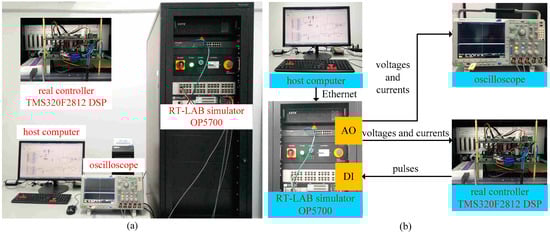 To verify the validity of simulation analysis, a hardware-in-the-loop experimental platform based on a real controller TMS320F2812 digital signal processor (DSP) (Texas Instruments, Inc, Dallas, TX, USA) and a real-time laboratory (RT-LAB) (Opal-RT Technologies, Montreal, QC, Canada) was built [26], as shown in Figure 16a. The system parameters are shown in Table 2. The hardware-in-the-loop experimental platform mainly includes an RT-LAB simulator OP5700 (Opal-RT Technologies, Montreal, QC, Canada), real controllers of grid-connected inverters, a host computer as a real-time control interface, and an oscilloscope, as shown in Figure 16b. The main circuit model of the system was established in the host computer, which was loaded to the OP5700. When the model was running, the OP5700 sent the analog signals (voltages and currents) to the real controllers through the input/output (I/O) ports in real time. After data processing, the real controllers transmitted the digital control signals (pulses) to OP5700 through the I/O ports in real time. The data interacted in real time during the simulation process to ensure the normal operation of the system. The measurement information during the simulation were converted into analog signals through the I/O ports, which could be observed on the oscilloscope.