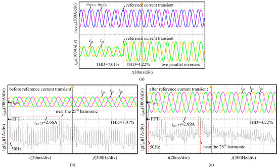 When two inverters operated in parallel, as in case I and case II, the RMS values of reference for the grid-side inductor current irefm for each grid-connected inverter increased from 18.75 A to 37.5 A at 0.405 s. Therefore, the RMS of reference grid-connected current igref increased from 37.5 A to 75 A for two parallel inverters. The transient experimental waveforms and spectrograms in case I and case II are depicted in Figure 17 and Figure 18. Experimental results of the grid-connected current with two parallel inverters are shown in Table 5. Before the reference current surged in Figure 17b, the distortion rate of the grid-connected current ig was 7.01%, the resonance point was near the 25th harmonic (1250 Hz), and the resonance peak was 2.66 A. After the reference current suddenly increased in Figure 17c, the distortion rate of the grid-connected current ig decreased to 4.22%, the resonance point was still near the 25th harmonic (1250 Hz), and the resonance peak value was 2.89 A. Thus, the grid-connected current apparently contained high-frequency ripples, and it is obvious that the major harmonics are 25th harmonics.