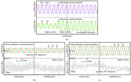 Experimental waveforms of PCC voltage uPCC and grid-connected current ig in case I during reference current transient (two parallel inverters). (a) PCC voltage uPCC and grid-connected current ig; (b) grid-connected current ig and spectrogram (before); (c) grid-connected current ig and spectrogram (after).