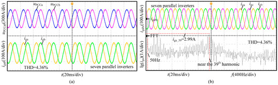Experimental waveforms of PCC voltage uPCC and the grid-connected current ig in case II (seven parallel inverters). (a) PCC voltage uPCC and grid-connected current ig; (b) grid-connected current ig and spectrogram.