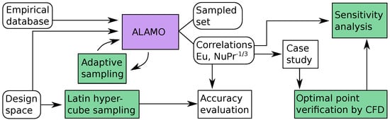 The overall correlation building and verification process used in this article is shown in Figure 1. A design space relevant for waste heat recovery units was firstly defined (see Table 2). An initial database of experimental work from the open literature was fed into the model building software ALAMO version 2018.4.3 []. A correlation was generated and improved through adaptive sampling of data points from the CFD simulator. The correlation was then evaluated using a separate validation set, as well as a case study where the optimal point was compared to an independent CFD simulation. The validation set consists of 30 CFD simulations selected through Latin hypercube sampling of the design space, as indicated in Figure 1. Finally, the trends in the different input variables were evaluated using CFD simulations and compared to correlations from the present and earlier work. The remainder of this section describes the components of the methodology in further detail.