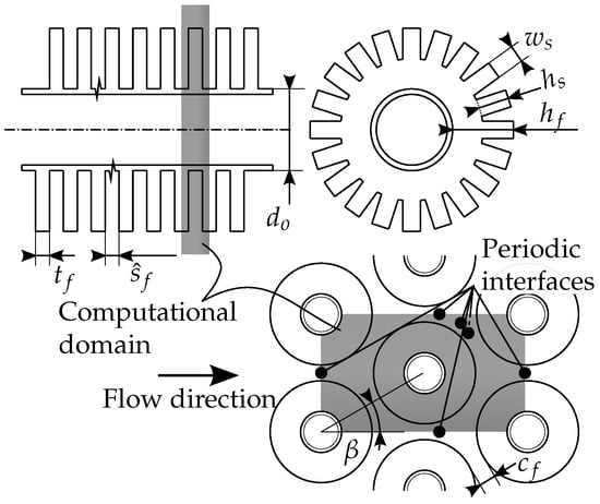 Figure 2. Geometric parameters of the fin-tube bundle and CFD computational domain. - Density and thermophysical properties were considered constant, properties for air were used for the external fluid and the fin thermal conductivity was set corresponding to carbon steel ( //).