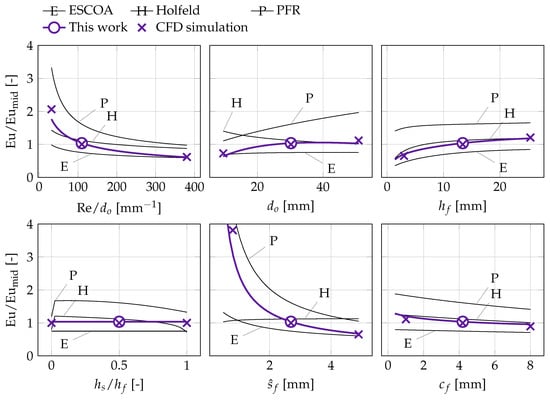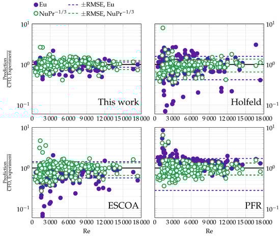The predictive accuracies for the reference correlations (Holfeld [], Escoa [] and PFR []) are, in general, poor due to the severe extrapolation induced by the design space definition. As shown in Figure 3, the general scatter for the reference correlations on all data in this work (empirical database, adaptively sampled simulations and simulations used for validation) is large, particularly for low Reynolds numbers. The PFR correlation for Eu has a relatively high coefficient of determination compared to the Escoa and Holfeld correlations, indicating that the hydraulic diameter (which is the unique feature of the PFR Eu correlation) may be a more robust length scale than the tube diameter. The high RMSE associated with the PFR Eu correlation is due to a positive bias (overprediction) that would be simple to rectify with a constant correction factor.