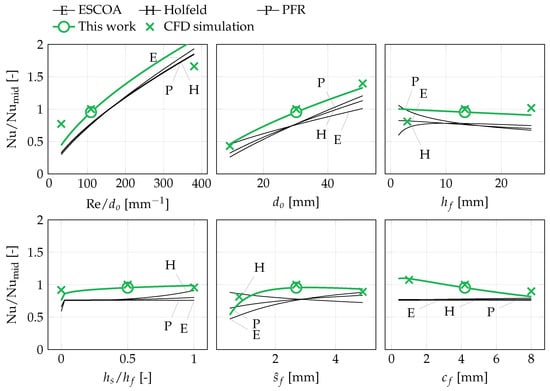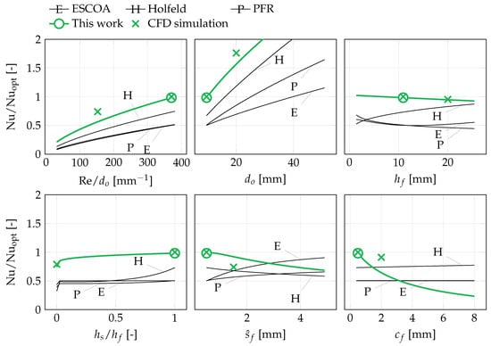 The Nusselt number is primarily a function of the flow velocity and the tube diameter (Figure 6 and Figure 8). Considering that , i.e., linear in , the heat transfer coefficient is approximately constant with the tube diameter as well as with the other geometric parameters. This can be expected in this case, since the heat transfer resistance consists of external boundary layers.