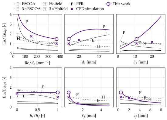 The reference correlations exhibit the correct variable trend in most cases. The PFR correlations captures the trend around the optimal point to a surprising degree, given its simplicity. The quantitative accuracy of the reference correlations, however, is not satisfactory at the optimal point. The Holfeld correlations, which are the most recently developed, grossly underpredict the pressure drop and show incorrect trends for Eu as a function of and Nu as a function of .