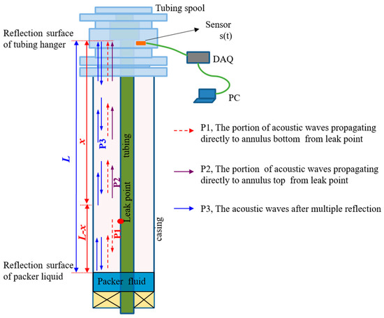 The tubing-production casing annulus is a closed space, both ends of which are sealed through the tubing spool and packer fluid. Two main reflecting discontinuities in the annulus are the liquid surface and tubing hanger. The leakage acoustic waves will travel upward and downward in the annulus simultaneously. The portion of the acoustic waves that travel to the annular top will be reflected by the tubing hanger and travel down to the liquid level. Similarly, the portion of the acoustic waves that travel to the annular liquid level will be reflected and travel to the top. These processes will continue until the acoustic energy is completely attenuated. As shown in Figure 2, three types of propagation modes of leakage acoustic waves in the annulus are analyzed. P1 is the portion of acoustic waves traveling downward and then upward. P2 is the portion of acoustic waves traveling upward. P3 represents the acoustic waves after multiple reflections. Therefore, the signals gathered by the microphone sensor simultaneously contain P1, P2, and P3. A time delay exists when P1, P2, and P3 propagate to the microphone sensor, which can be obtained through proper signal processing. The process will be described later.