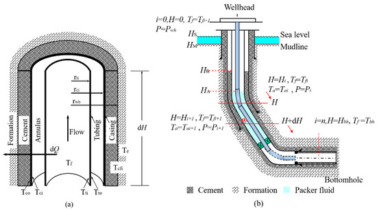 Heat transfer occurs between the production fluids and the surrounding media in a flowing well due to the temperature difference. The temperature distribution in the wellbore can be derived on the basis of the fluid–energy balance and heat transfer equations. It is assumed that [29,30] (1) the heat transfer in the wellbore is in a steady state, while the heat transfer from wellbore to the formation is in a non-steady state; (2) only radial heat transfer is considered; and (3) the formation temperature varies proportionally with depth. Therefore, the equilibrium equation for the element dH, which is shown in Figure 3, can be expressed as