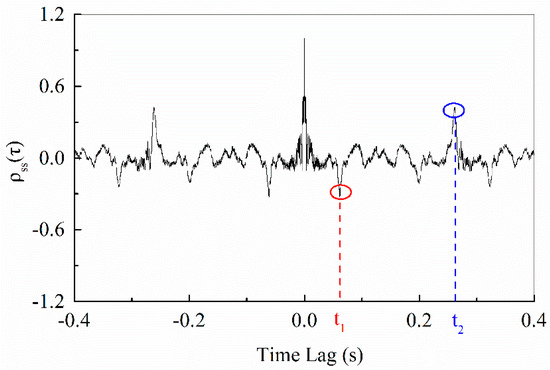 Next, t1 and t2 are obtained by extracting the extreme values of . Figure 4 shows the autocorrelation curve of the acoustic signals collected in tubing leakage. The method of extracting the characteristic time is presented, with t1 corresponding to the first negative peak and t2 corresponding to the first positive peak in the autocorrelation curve.