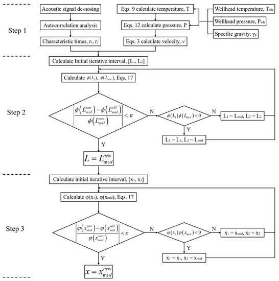 Step 3: Leak depth is calculated. The leak depth is obtained by solving the second function in Equation (17), with the use of the dichotomy searching method. The value xmid is equal to (x1 + x2)/2.