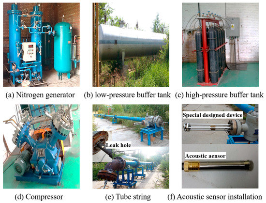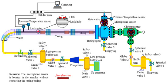 To study the effectiveness of the proposed method, a series of laboratory experiments were designed and conducted with the experimental system, as shown in Figure 6 and Figure 7. The system contained a 47 m long tube string, tubing spool, gate valve, a set of compressors, high-pressure and low-pressure buffer tanks, many valves, and an acoustic data acquisition system. The tube string was a double-layered structure. Tubing with an outer diameter of 88.9 mm and casing with an outer diameter of 244.5 mm were used to simulate the wellbore structure, to which a full-scale tubing spool was connected at one end and sealed on the other. To simulate the liquid level in the annulus, a bent tube filled with water was added to the end of the tube string. A completely sealed annulus with a length of 46.9 m was formed. The experimental platform was horizontally placed, and the distance between the tubing spool and leak points on the tubing was the simulated depth of the leak location.